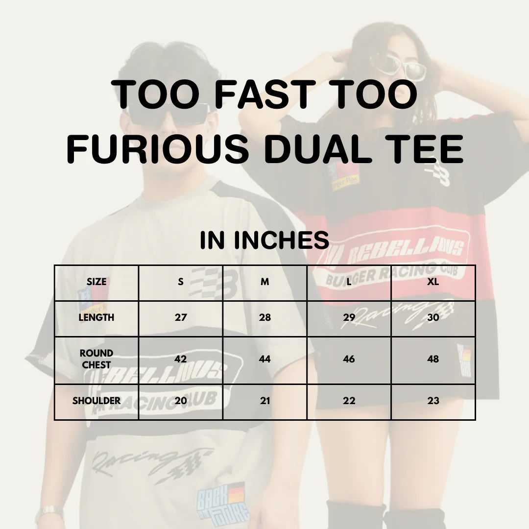 Unleash your inner racer with the Too Fast Too Furious Dual Tee from Burger Bae, now on ZAVE. This bold, oversized streetwear piece is designed for both men and women, featuring racing-inspired graphics, striking typography, checkered flag motifs, and vibrant color blocking. Perfect for making a motorsport-inspired fashion statement, this tee combines edgy style and comfort for casual outings or standout streetwear looks.