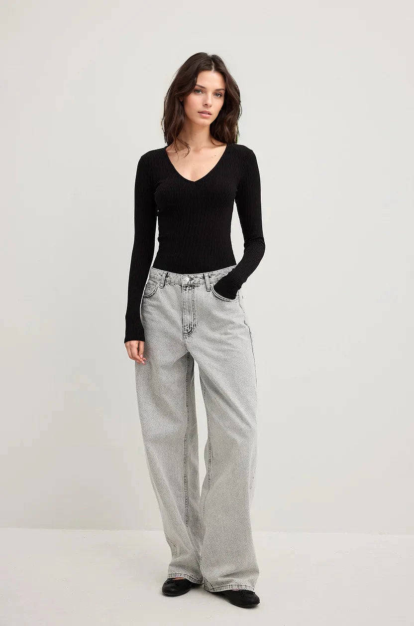 MWB V-Neck Ribbbed Long Sleeve Top